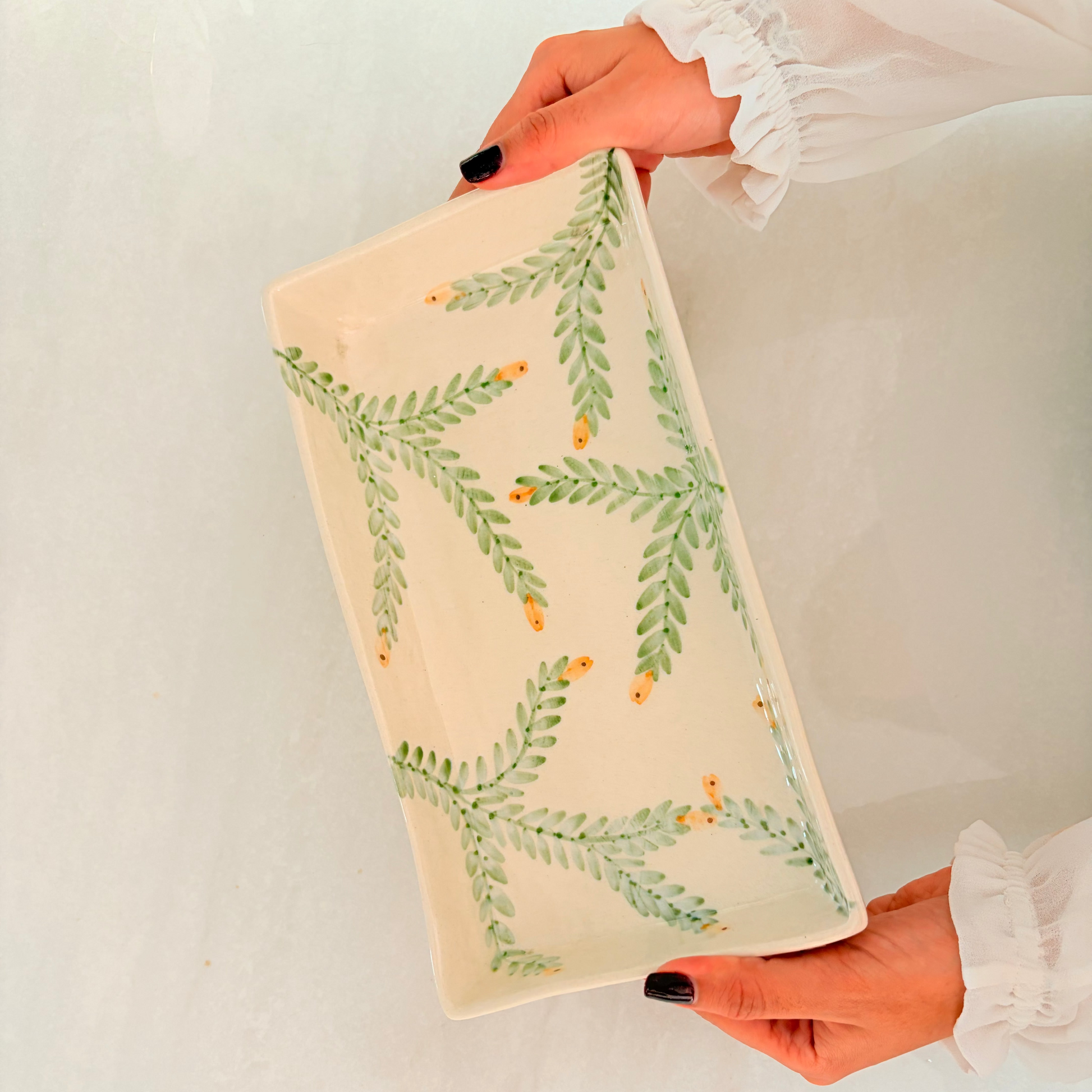 - Hand-painted artisan finish with graceful olive branch and leaf designs