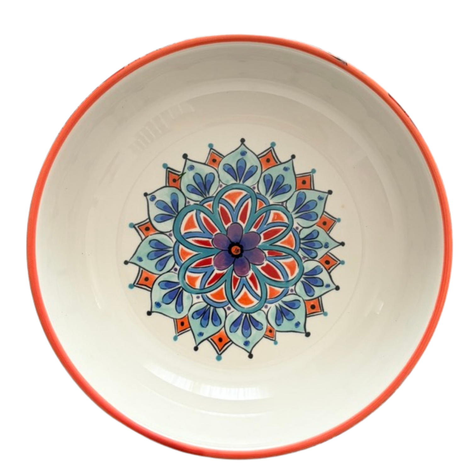 Inspired by Mediterranean hand-painted ceramics, this deep dish features a floral mandala-style design with bold blues, oranges, and purples — perfect for adding personality to everyday meals.