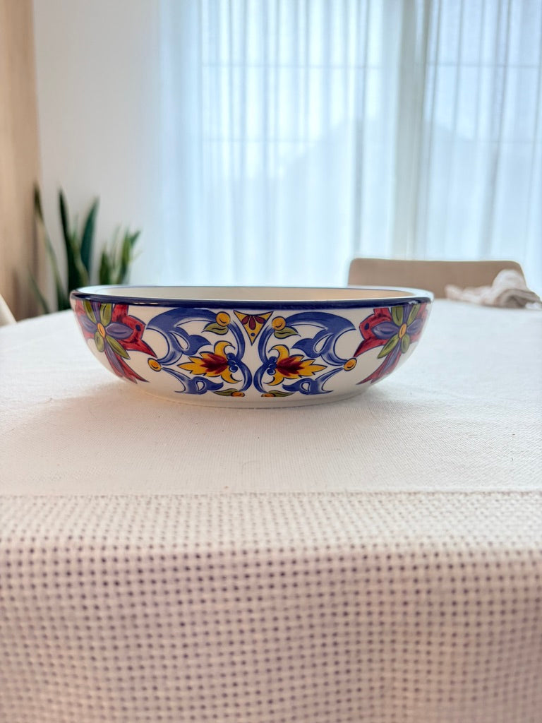 Inspired by Mediterranean hand-painted ceramics, this deep dish features a floral mandala-style design with bold blues, oranges, and purples — perfect for adding personality to everyday meals.