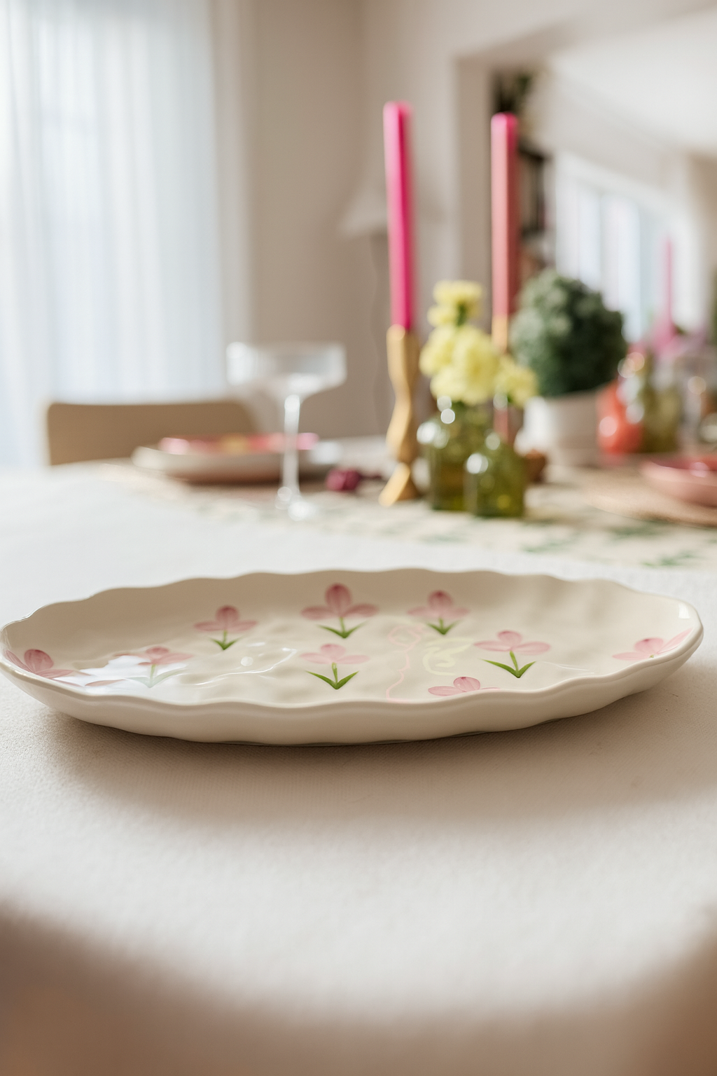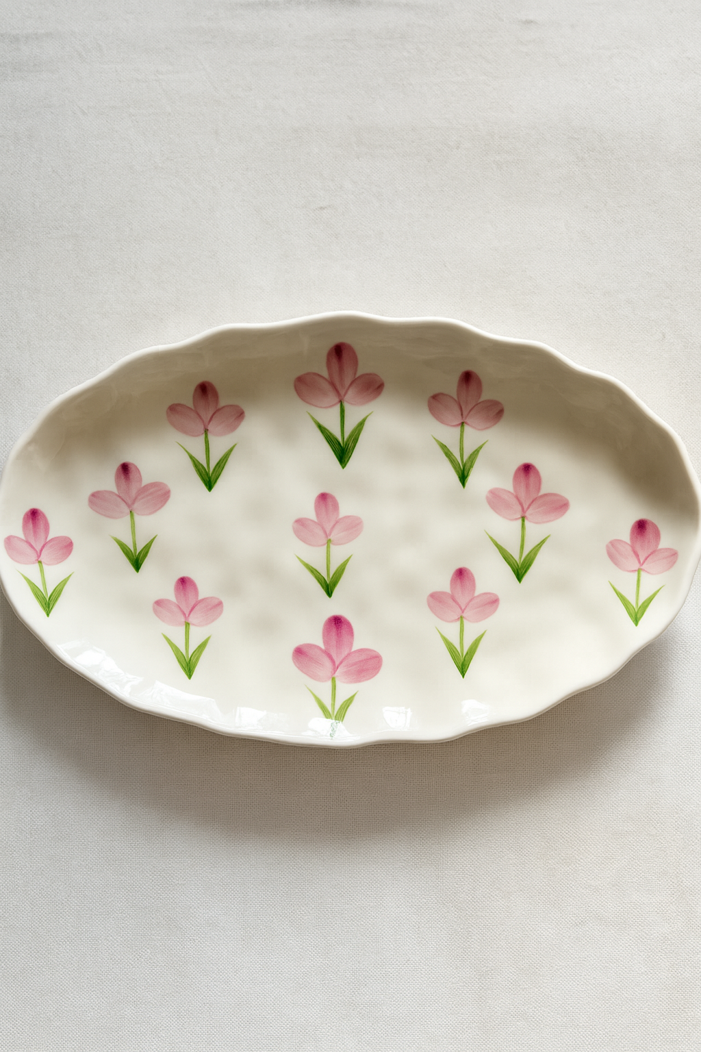 A soft, floral oval plate with a gently irregular, hand-formed shape that gives it a warm, organic feel.
