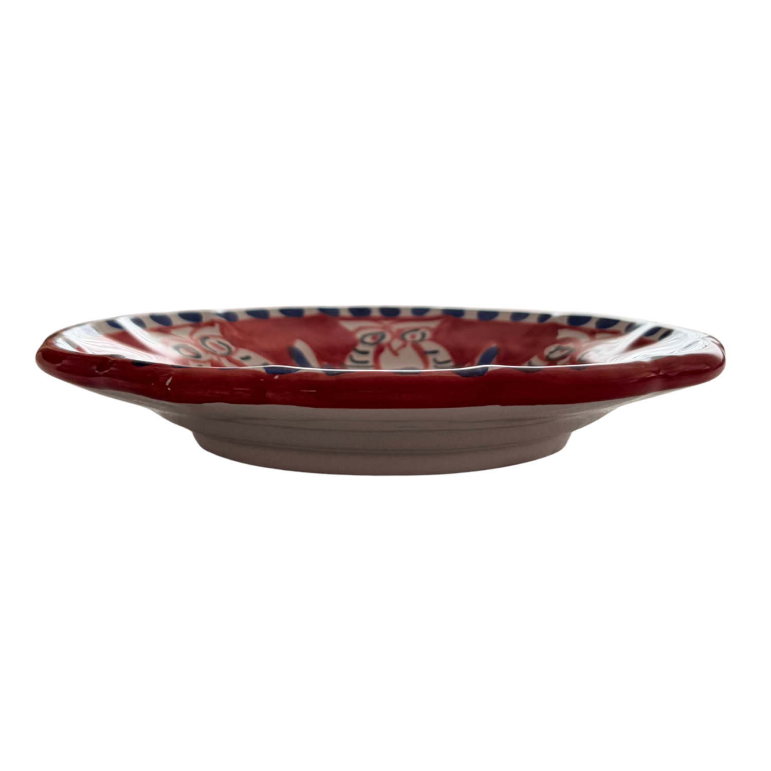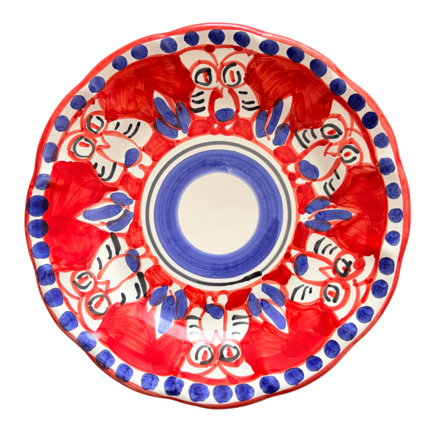 Inspired by the traditional folk motifs of Southern Italy, the Civetta plate features a ring of hand-painted owls in warm red tones, accented by deep Mediterranean blue. Playful yet timeless, it brings a touch of character and storytelling to the table — like a cozy evening shared with friends.