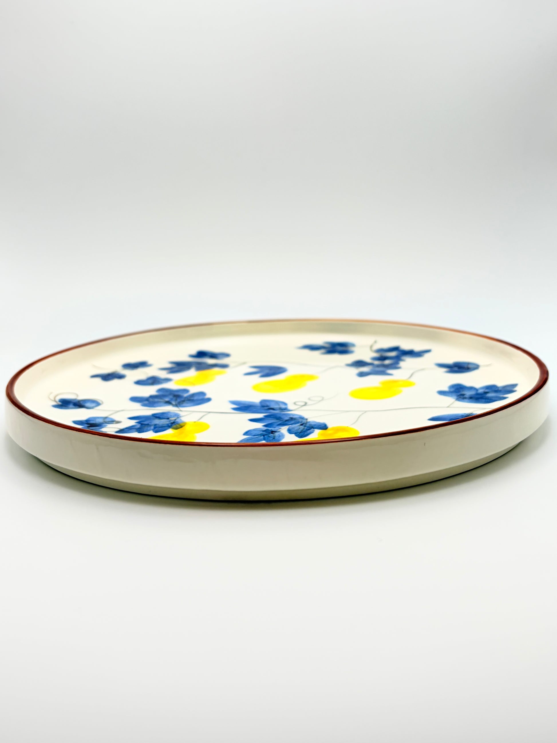 A soft blend of artistry and craftsmanship, the Serena Plate features hand-painted indigo florals intertwined with warm golden gourds. Each piece is crafted by skilled artisans using a blend of traditional brushwork and modern porcelain techniques, giving it a smooth, refined finish while preserving the charm of hand-painted details.