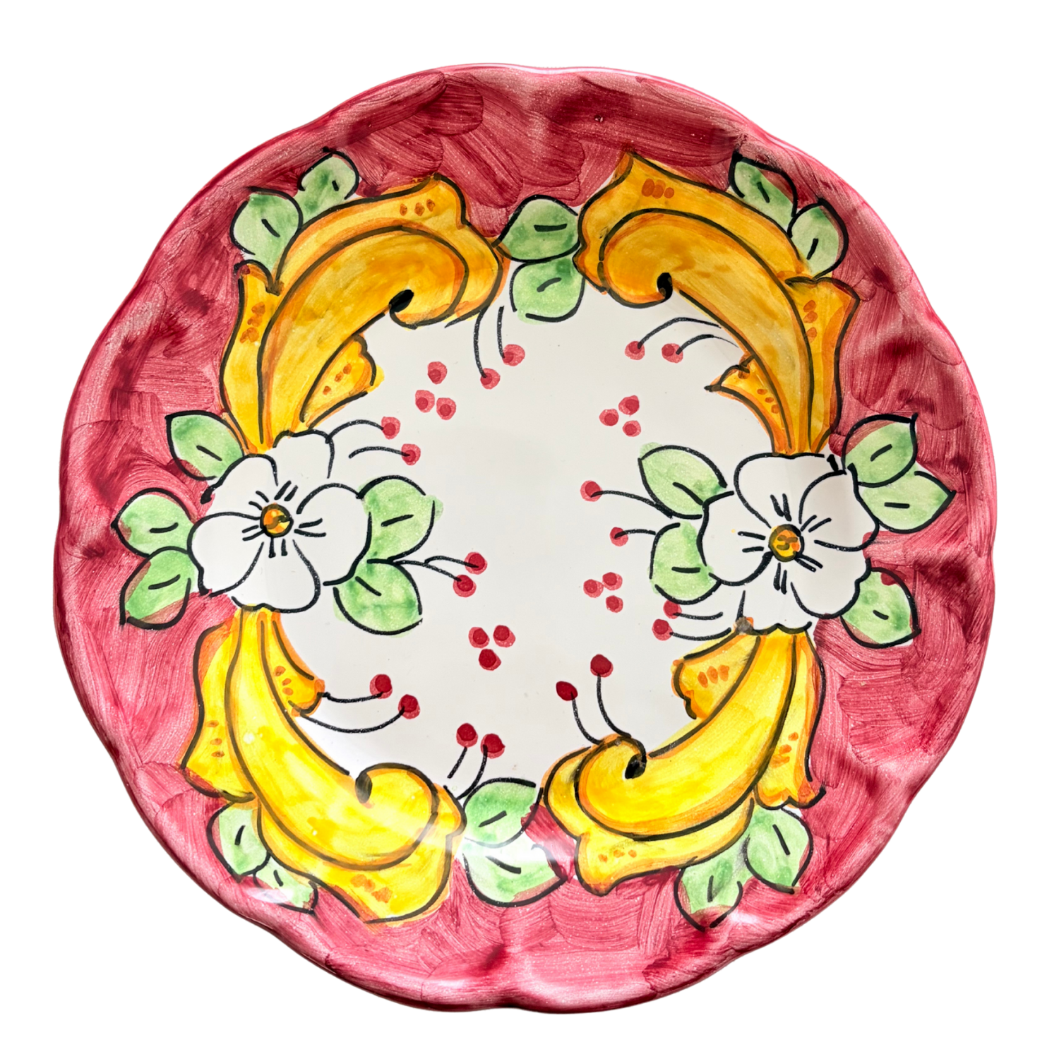 The Amoretti Plate is hand-shaped and hand-painted in Vietri sul Mare using traditional pottery techniques. The deep rosato border, vibrant yellow scrolls, and delicate white florals create a warm, inviting palette that feels like a long lunch under the lemon trees.