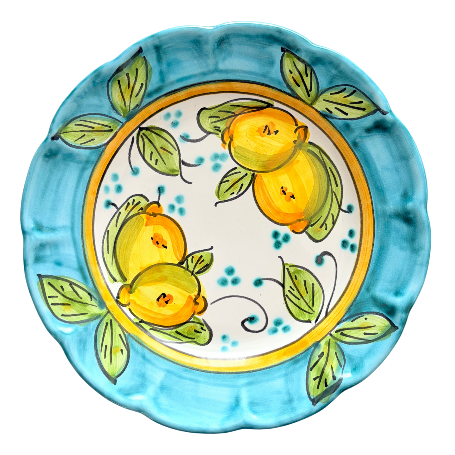 Inspired by the bright lemon groves and turquoise waters of the Amalfi coast, the Lido plate brings a refreshing Mediterranean charm to the table. Each piece is hand-shaped and hand-painted in Vietri sul Mare using traditional ceramic techniques, featuring sunny lemons framed by a soft sea-blue rim.